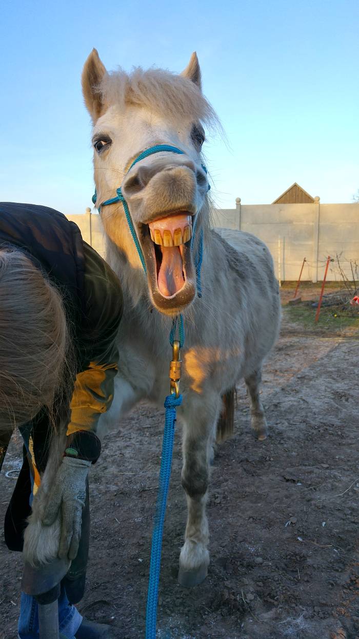 Im Anschluss an seine Pediküre steht er, entspannt gähnend dabei, während die Hufe seines Pferdefreundes bearbeitet werden.